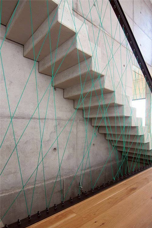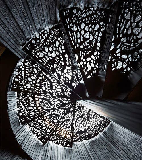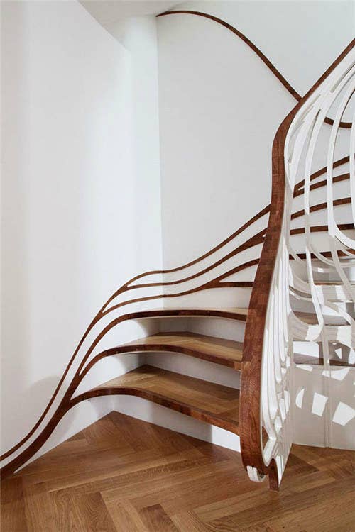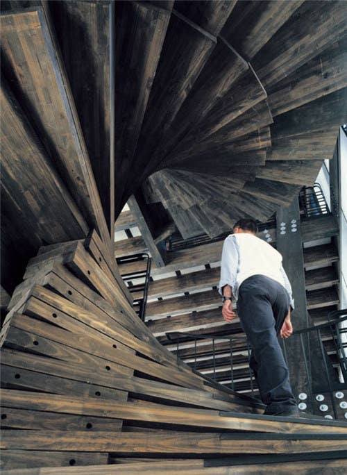 Stairs with a sense of sculpture are parts of a private apartment designed by Alex Haw in Atmos Studio. The stairs ate twisting in the center of the living space, integrating the flow form and anchor line organically.