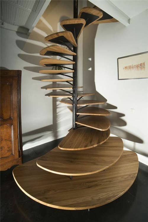 It's another example of graceful and pretty spiral stairs. It's also made by the wood, the petals stairs surrounding with the metal pole, only taking a small corner of the room.